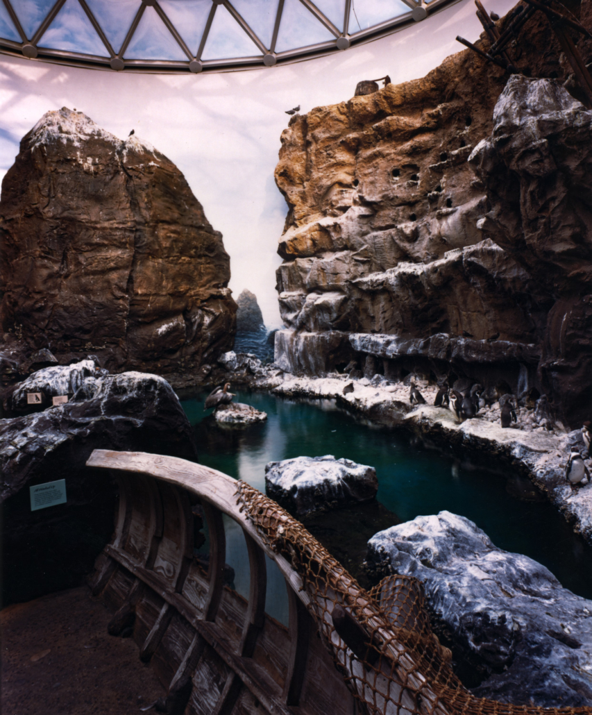ThemeWorks provided complete fabrication for this award-winning exhibit that is based upon the biologically rich coasts of Chile and Peru. ThemeWorks fabricated and installed 18,000 square feet of highly durable and highly detailed artificial rockwork complete with encrusting fauna. The exhibit includes large aquariums, a central aviary with soaring cliffs, a vampire bat exhibit, invertebrate jewel tanks, and the popular Wave Crash. Careful planning and consultation with biologists and zoo staff ensured the creation of a safe and viable marine habitat for the animals that now inhabit the exhibit.